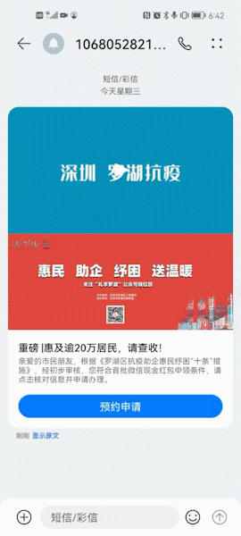 鉴于本次补贴将惠及罗湖区22.5万人,覆盖面广、惠民力度大,确保补贴措施能够及时触达至每一位居民,并最大程度简化补贴措施领取方式成为本次补贴发放工作的重点。为确保居民方便快捷的领取补贴,凯发k8官网科技携手深圳联通助力罗湖区人民政府向扶持对象统一推送5G申领短信息,顺利获得视频、图片及申领提醒内容,详细指导用户如何操作。