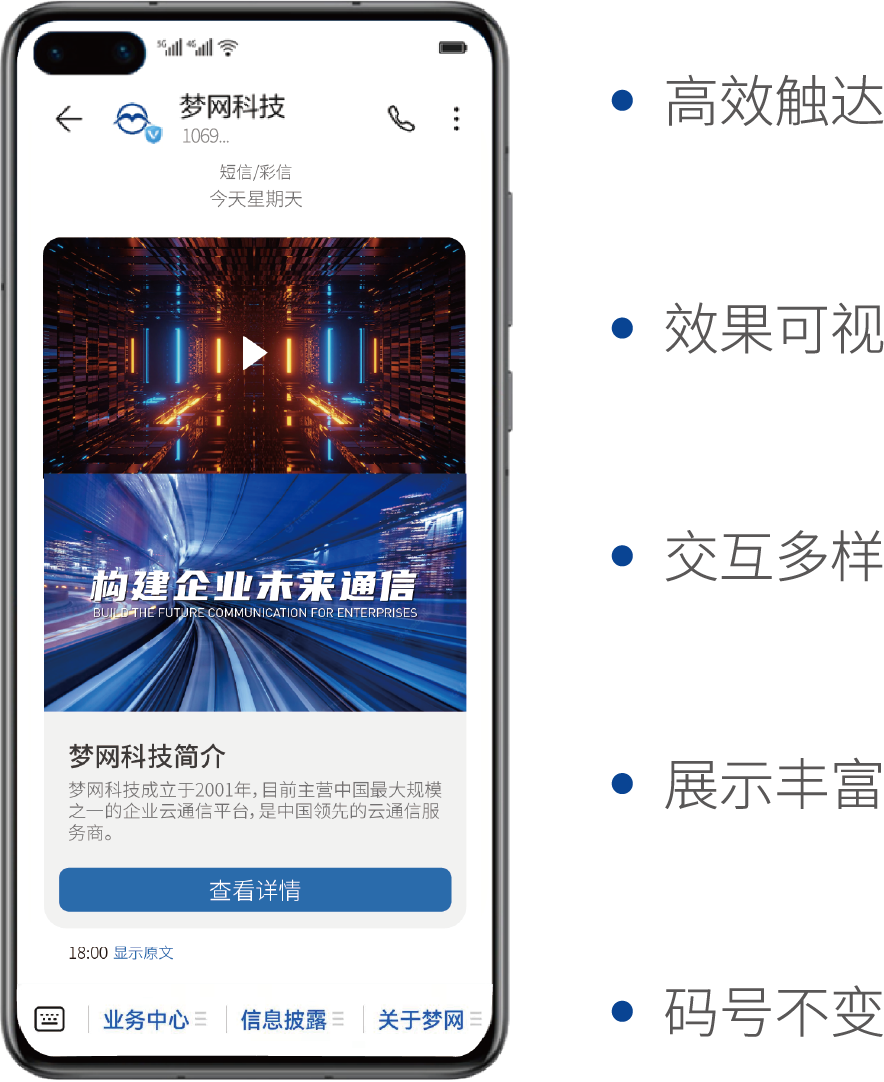 AIM消息利用手机终端短信增强技术,实现传统短信的平滑升级,无需用户关注/订阅/下载/安装,可基于手机号直接投送。