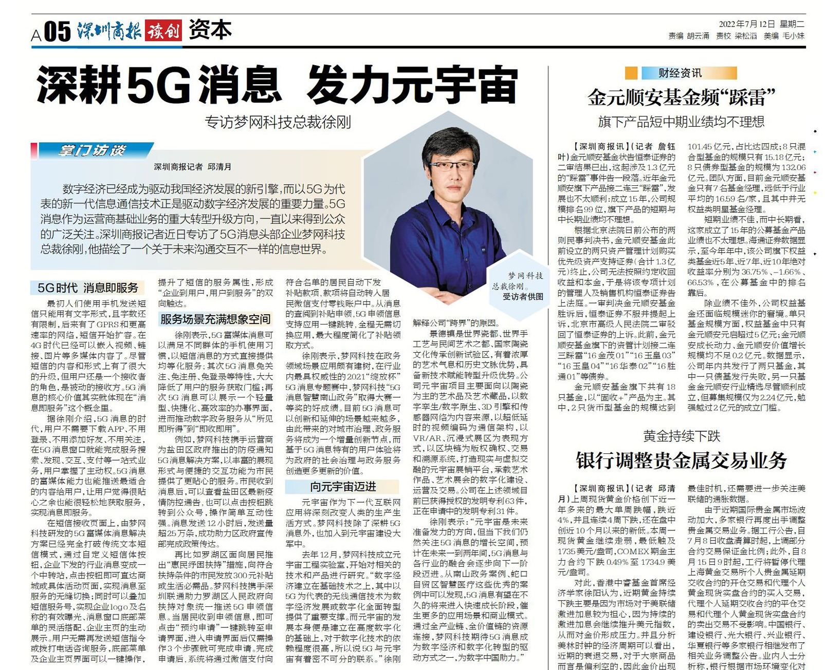 数字经济已经成为驱动我国经济开展的新引擎,而以5G为代表的新一代信息通信技术正是驱动数字经济开展的重要力量。5G消息作为运营商基础业务的重大转型升级的方向,不断以来得到公众的广泛关注。深圳商报记者近期专访了5G消息头部企业凯发k8官网科技(002123)总裁徐刚,他描绘出了一个关于未来沟通交互不一样的信息世界。